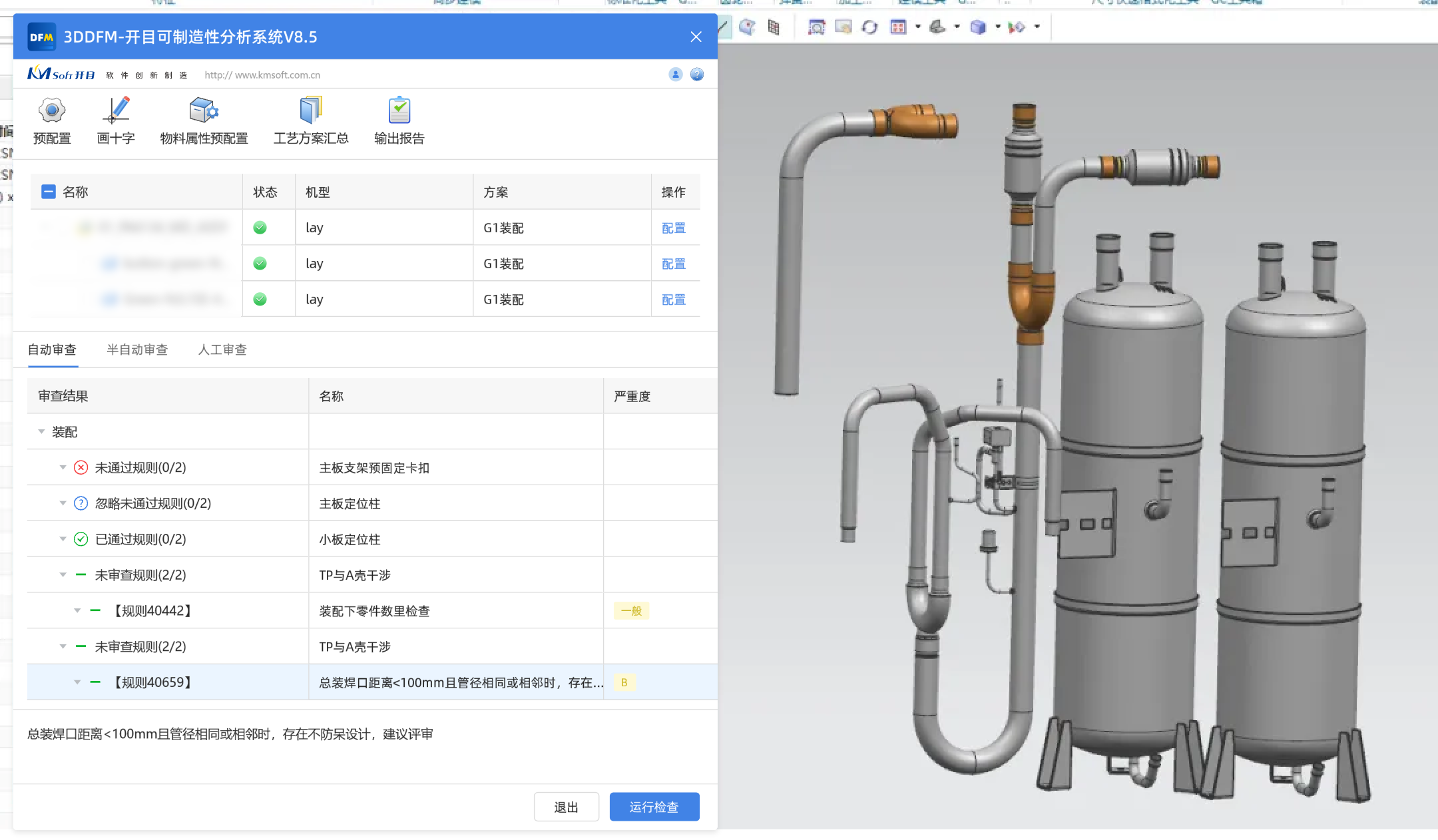 開目 3DDFM 8.0 新版本在家電行業(yè)對鈑金、注塑、裝配、配管、兩器等專業(yè)審查規(guī)則進(jìn)行拓展開發(fā),成功構(gòu)建了家電行業(yè)審查知識庫,建立了家電行業(yè)工藝可制造性評審模型,并搭建了完整的工藝評審體系。該體系將結(jié)構(gòu)化、規(guī)范化的可制造性標(biāo)準(zhǔn)前置至研發(fā)產(chǎn)品設(shè)計階段,使產(chǎn)品在開發(fā)設(shè)計之初就充分考慮到可制造性因素,實(shí)現(xiàn)一鍵式智能評審,極大地減少了評審過程中的人為工作量,大幅縮短了新產(chǎn)品研制周期。