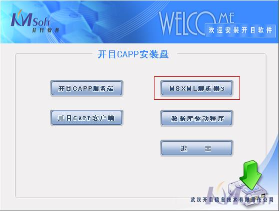 運(yùn)行開目CAPP 安裝盤中的KmcappSetup.exe文件,在彈出的安裝界面中,點(diǎn)擊“MSXML解析器3”按鈕安裝即可。