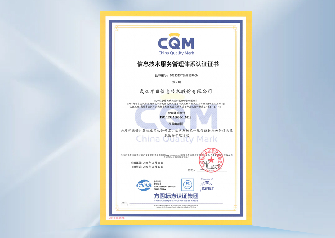 此次通過ISO20000體系認(rèn)證,標(biāo)志著開目軟件已構(gòu)建成包含組織架構(gòu)、服務(wù)管理流程、IT支撐系統(tǒng)和IT服務(wù)管理信息的一體化管控體系,具備輸出安全、可靠、高效的IT服務(wù)綜合實(shí)力,IT管理和服務(wù)水平邁上了一個(gè)新臺(tái)階。