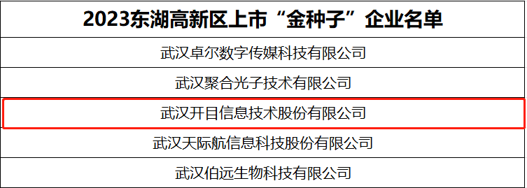 近日,2023年武漢市東湖高新區(qū)上市“金種子”、“銀種子”企業(yè)名單正式發(fā)布。經(jīng)企業(yè)申報、材料審核、專家評審等一系列嚴(yán)格的審查程序,武漢開目信息技術(shù)股份有限公司作為重點上市后備梯隊,成功入選“金種子”企業(yè)名單。