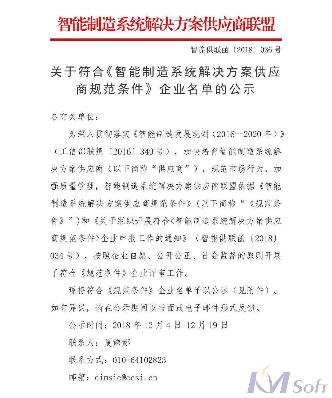 2018年12月4日,由中國智能制造系統(tǒng)解決方案供應(yīng)商聯(lián)盟組織的“符合《智能制造系統(tǒng)解決方案供應(yīng)商規(guī)范條件》企業(yè)”評選結(jié)果正式出爐,經(jīng)專業(yè)審查,在全國范圍內(nèi)共評審出82家符合《規(guī)范條件》的企業(yè),武漢開目信息技術(shù)股份有限公司有幸入選其中。