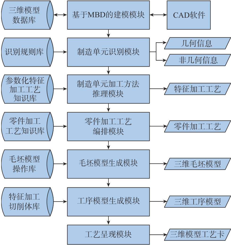 三維數(shù)字化工藝設(shè)計(jì)首先利用特征提取和識(shí)別技術(shù)分析零件MBD 模型,得到以特征為單位的幾何、工藝信息。然后,通過工藝推理和決策模塊獲得所提取特征,識(shí)別加工需要的設(shè)備和工藝參數(shù)信息。在此基礎(chǔ)上,通過人機(jī)交互編排工藝過程確定每道工序加工內(nèi)容,再構(gòu)建零件毛坯模型,然后基于每道工序加工內(nèi)容正向從毛坯到零件自動(dòng)創(chuàng)建每道工序的三維工序模型,最后推理每道工序的設(shè)備及刀具等加工參數(shù),從而形成零件的加工工藝過程。數(shù)字化工藝設(shè)計(jì)軟件技術(shù)路線如圖1所示。