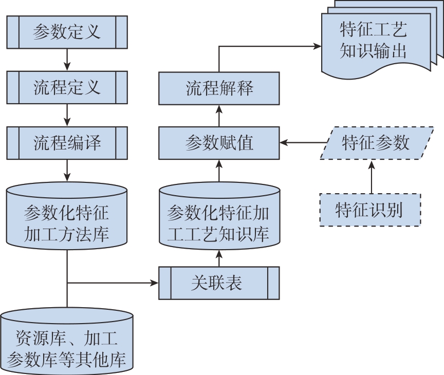 構(gòu)建一個(gè)參數(shù)化工藝設(shè)計(jì)平臺(tái)來(lái)使用工藝知識(shí)庫(kù)中的加工方法推理邏輯流程,通過采用參數(shù)過程圖技術(shù)實(shí)現(xiàn)特征工藝知識(shí)的表達(dá)、定義、解釋和輸出。定義參數(shù)過程圖是工藝知識(shí)表達(dá)和應(yīng)用的核心模塊,其核心功能主要包括參數(shù)定義、流程定義、流程解釋等功能,如圖6 所示。