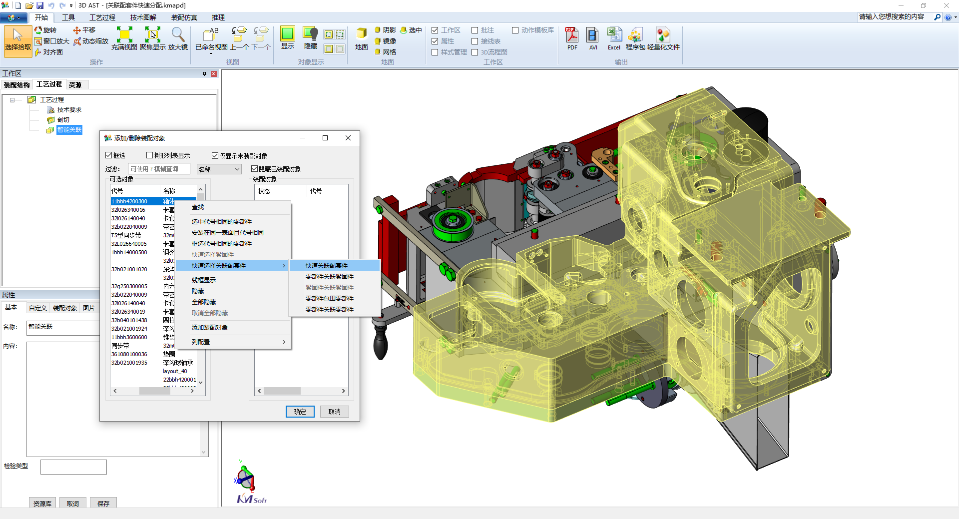 開目3DAST研發(fā)團隊通過三維裝配模型零部件特征之間的拓撲關(guān)系,基于國際、國家及行業(yè)標準和開目在工業(yè)軟件多年的技術(shù)積累,自主研發(fā)了零部件智能關(guān)聯(lián)算法,包括零部件關(guān)聯(lián)緊固件、緊固件關(guān)聯(lián)緊固件、零部件包圍零部件等??梢栽谶x擇某零部件的同時智能推斷出與其有關(guān)聯(lián)關(guān)系的零部件,進行一次性添加,實現(xiàn)工序規(guī)劃階段零件的選取效率提升50%以上。