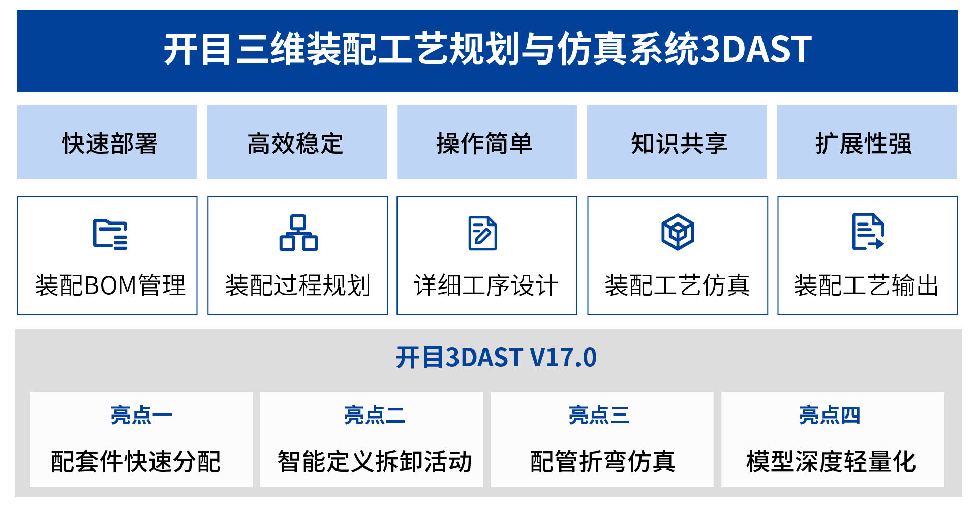 隨著制造企業(yè)數(shù)字化轉(zhuǎn)型、智能化升級的深入推進,在裝配工藝設(shè)計過程中,高端制造用戶對工藝路徑智能推薦、復雜空間拓撲結(jié)構(gòu)中大型裝配體的工藝規(guī)劃、大模型文件深度輕量化、軟件易用性等方面提出了新需求。為此,開目軟件以用戶需求為導向,憑借深厚的技術(shù)積累,重磅推出3DAST 17.0新版本,亮點頗多。