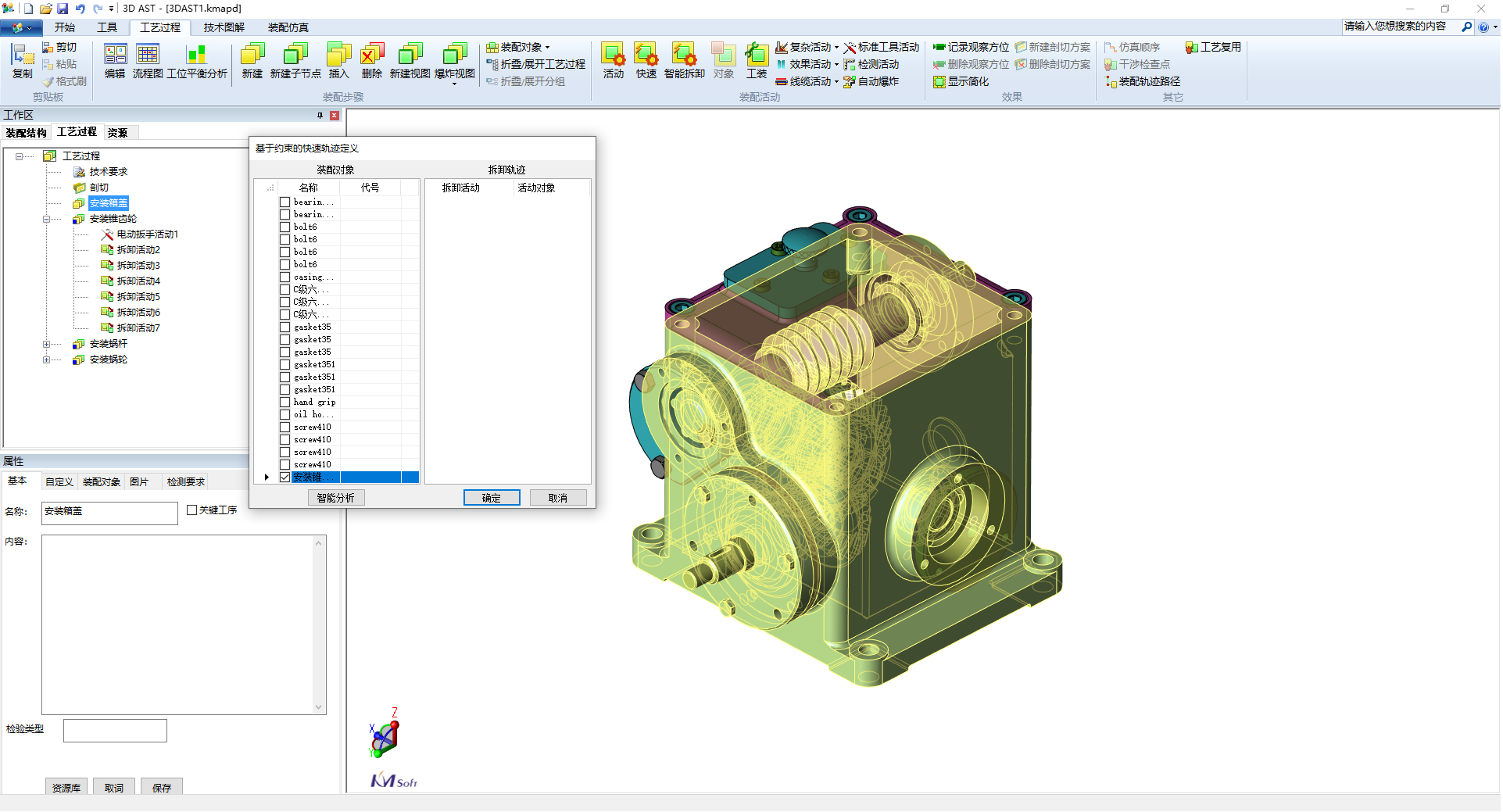 結(jié)合經(jīng)典圖形算法及數(shù)據(jù)結(jié)構(gòu),開目3DAST研發(fā)團隊開發(fā)出基于約束的快速定義拆卸活動功能。針對工序進行拆卸活動時,對工序的對象進行空間位置與接觸關(guān)系的分析,自動推薦該工序零部件的拆卸順序與運動軌跡。如在減速器箱蓋的裝配規(guī)劃中,通過智能拆卸功能可以將軸承蓋、箱蓋及各緊固件進行快速規(guī)劃,整體操作效率提升20%以上。