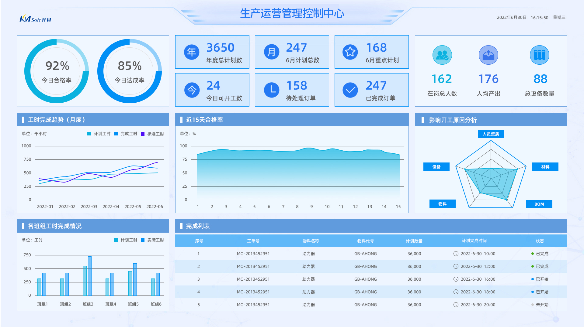 KMMOM CLOUD V3.0涵蓋生產(chǎn)管理、計(jì)劃排程、制造執(zhí)行、倉(cāng)儲(chǔ)管理、質(zhì)量管理、工時(shí)管理、設(shè)備管理、工裝管理、外委管理等核心功能,實(shí)現(xiàn)高端制造從訂單-計(jì)劃-生產(chǎn)交付的全鏈路數(shù)據(jù)穿透與端到端智能閉環(huán)管理,提升企業(yè)制造運(yùn)營(yíng)效率與產(chǎn)品交付能力。KMMOM支持多種途徑的訂單接收和拆分、排程優(yōu)化以及資源分配和任務(wù)下達(dá),實(shí)現(xiàn)訂單狀態(tài)的實(shí)時(shí)動(dòng)態(tài)追蹤,以及多層級(jí)多維度的生產(chǎn)監(jiān)控;