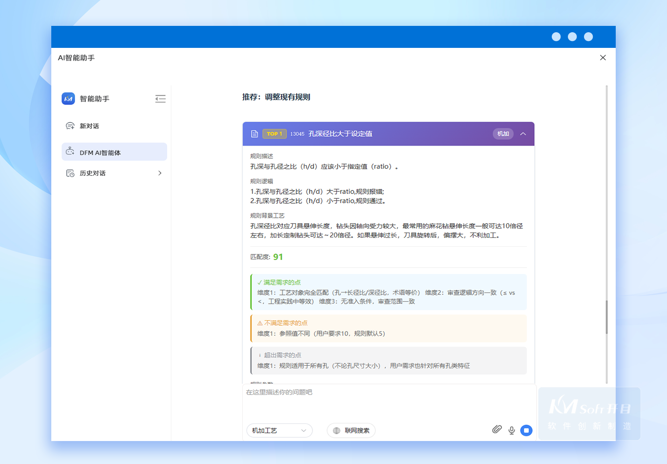 3DDFM 規(guī)則適配智能體突破傳統(tǒng)關(guān)鍵詞搜索的局限,采用語義級(jí)深度匹配技術(shù),真正理解工藝規(guī)則的內(nèi)在邏輯。通過公式等價(jià)性驗(yàn)證、術(shù)語關(guān)系推理等深度語義分析,能夠精準(zhǔn)識(shí)別表面表述不同但工藝本質(zhì)一致的規(guī)則。