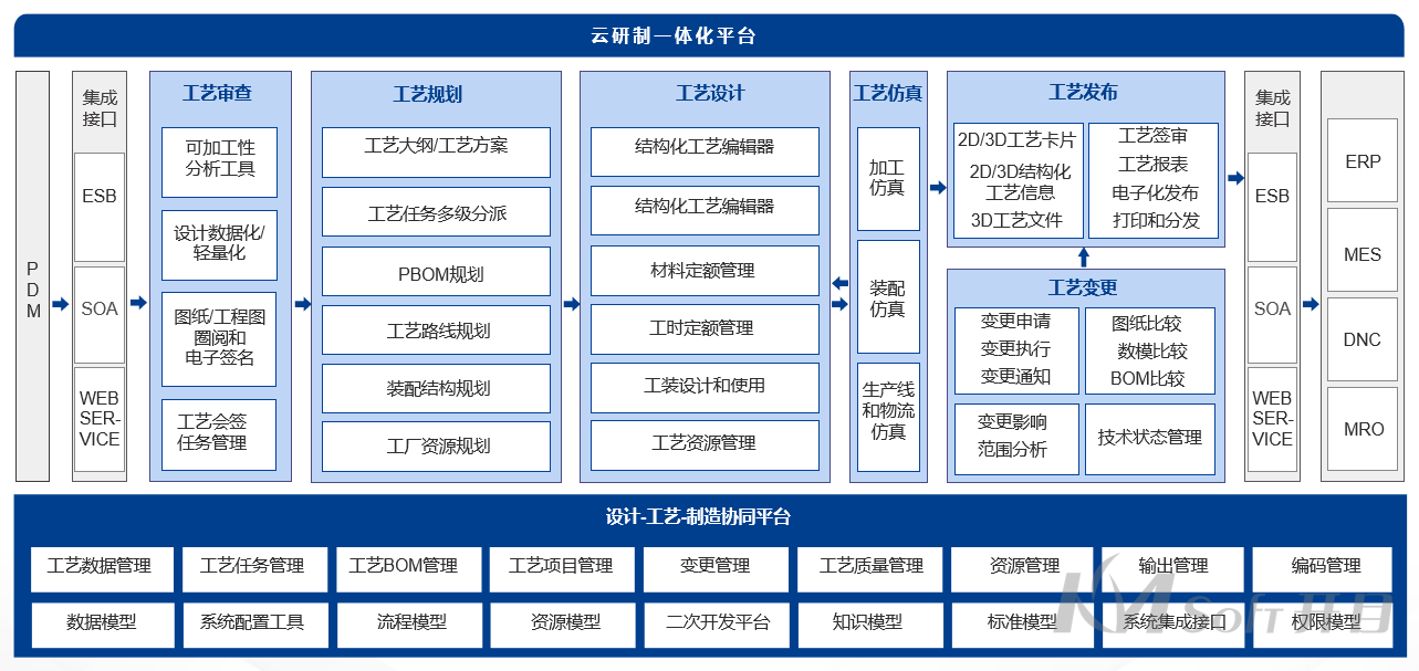 與PLM/MES/ERP以及設計和仿真工具的集成管理,承接上游設計數(shù)據(jù),強化工藝橋梁作用,為下游生產提供業(yè)務所需的各類工藝要素,保證工藝數(shù)據(jù)的一致性、及時性及完整性;